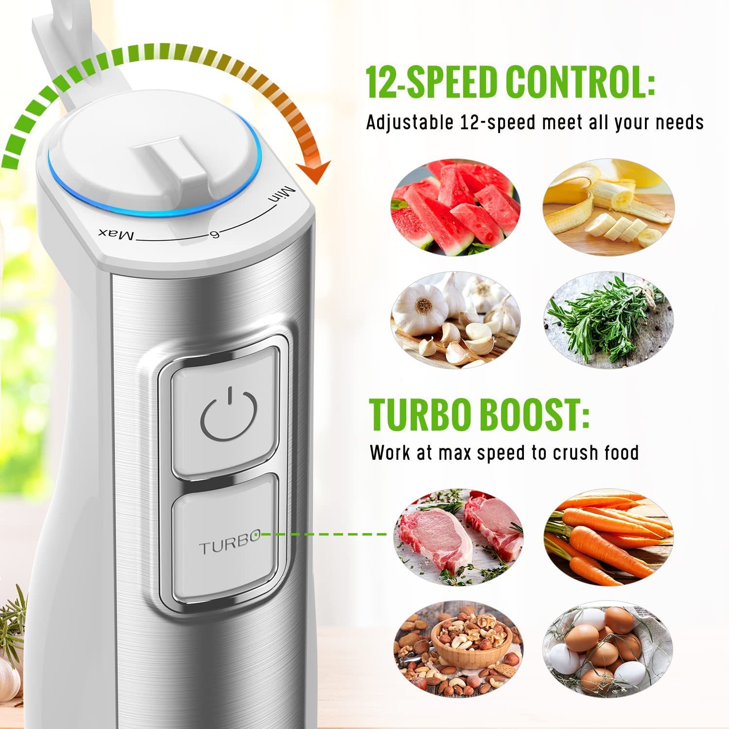 2.Limitless Power: Chop, puree and mix all ingredients to perfection in a flash with 1100W heavy-duty immersion hand blender copper motor. 12-speed/Turbo blending presets give you max control over your cooking